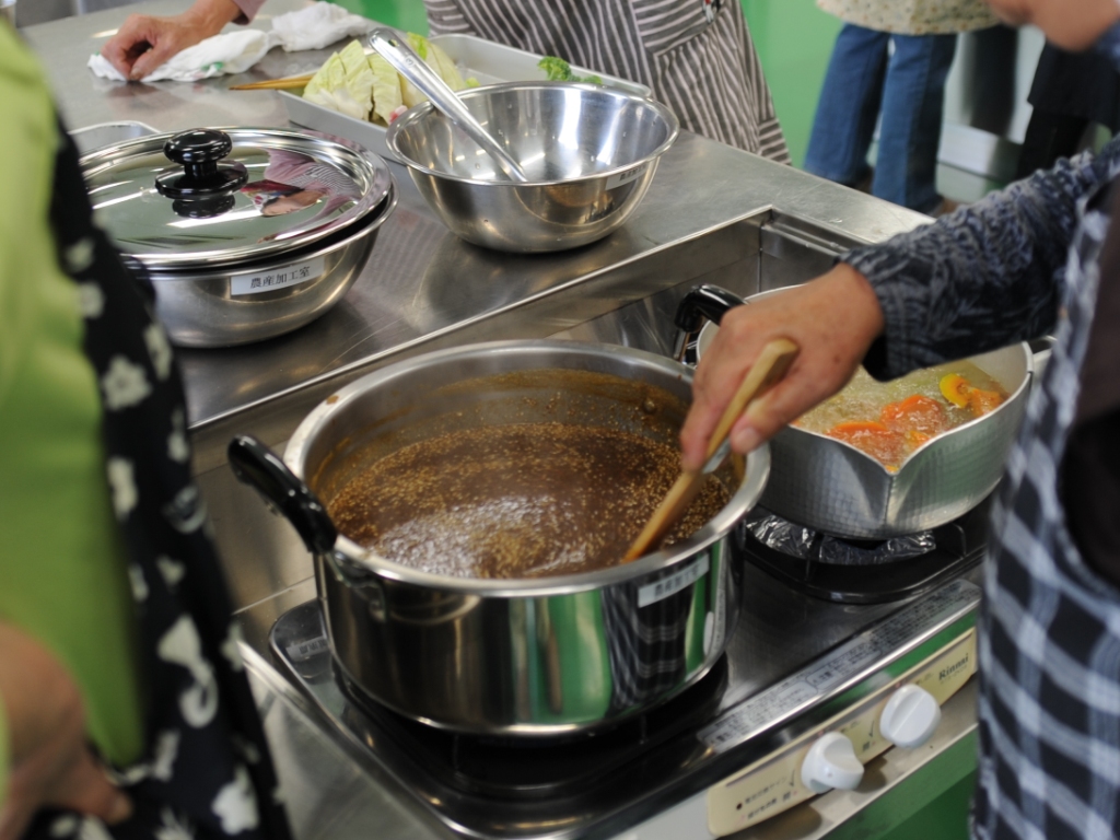 10月29日、豊橋産の柿を使った万能だれの実習を行い、28名が受講しました。講師の村松桂子氏は、豊橋市内の農業者であり、また農産物加工品を販売する店を3年前にオープンさせ、活躍されています。今回はその店で実際に販売しているたれの加工方法を教わりました。万能だれは、醤油ベースで今回は柿を使いましたが、イチゴやナシなど季節の果物を入れて作ることもできます。原材料の果物や調味料の量は自分の好みで変えられるので、ぜひ「マイだれ」を作って欲しいとお話がありました。できたたれは、保存性を高めるためビンに詰めて殺菌消毒をしました。このたれは、炒め物、焼き肉、チャーハン、カレーの隠し味など、様々な料理に使えるとあって、「家でも作ってみたい」という声が聞かれました。