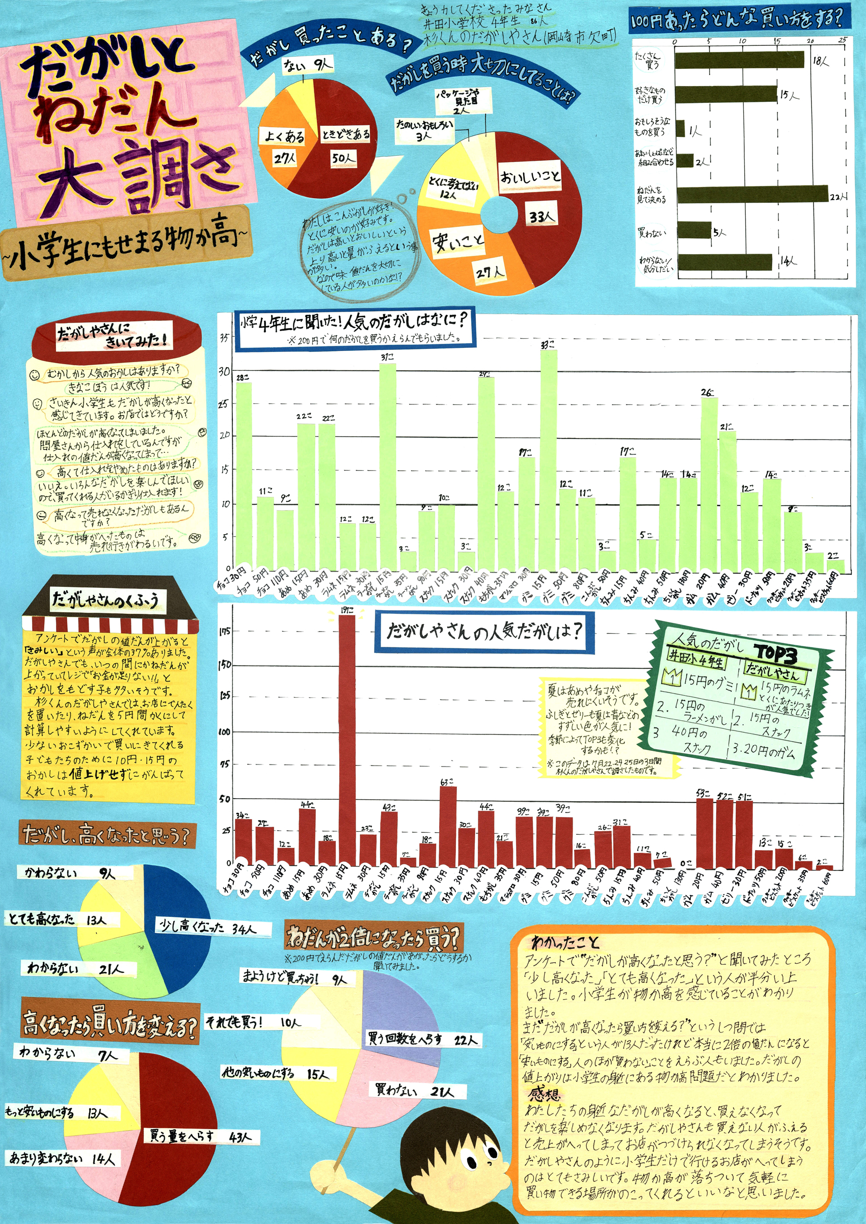 駄菓子の値上がりに注目し、実際にお店の人に話を聞いて調べる工夫がよく伝わります。お小遣いの使い方を考えながら、買い物の工夫や駄菓子屋さんの思いにも目を向けた、面白い調査です。 |