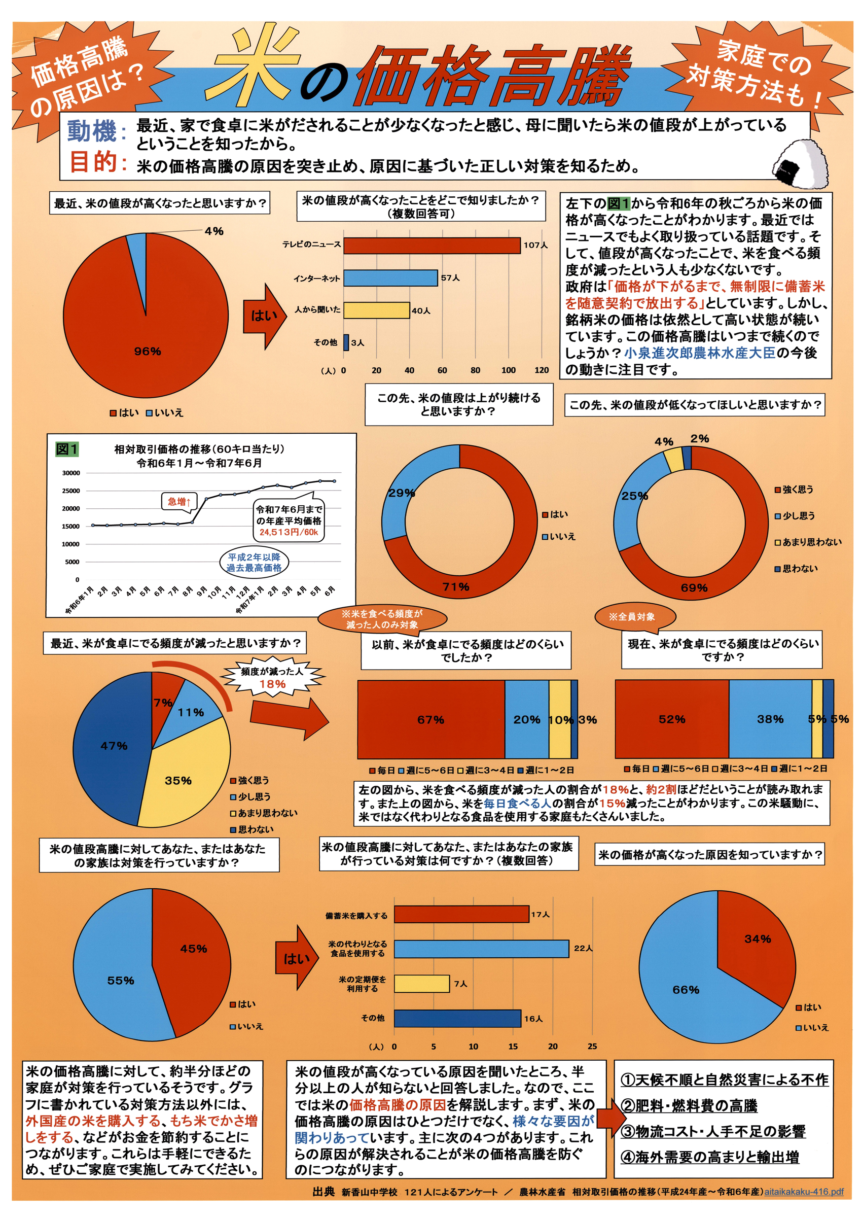 作品上部のイラストや文字、アイコンに工夫があり、情報が整理されていて見やすい作品です。物価高という難しいテーマを、調査や分析を通して丁寧に伝えている点が優れています。 |