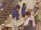 実施場所となった飲食店街の通路には、平日にもかかわらず人の流れが多く、たくさんの来場者がありました。アンケートにも積極的にご協力して下さる方が多く、一時は順番待ちが出るほどでした。南区在住の女性お二人の方から、「南区浜田町の靴塚は有名(伊勢湾台風で大量の履き物が流れ着いた場所)で毎年慰霊蔡が行われている」とのお話をお聞きしました。また、新潟出身の方(中越地震のときに名古屋に越してきた方)から、「地震の際には食器棚の戸が外れただけで食器は落ちてこなかった」とのお話をうかがいました。