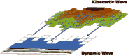 従って、流出域と氾濫原の境界を固定することができないので、流出域モデルと氾濫原モデルの2層のモデルを作成し、浸水深に応じて上流側移動する境界で接合しています。 |