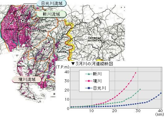 新川流域は、日光川流域と境川流域の中間に位置し、山地〜扇状地〜低平地へとなだらかに連なり、氾濫水深の増大とともに氾濫原が徐々に拡大していきます。