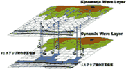 従って、流出域と氾濫原の境界を固定することができないので、流出域モデルと氾濫原モデルの2層のモデルを作成し、浸水深に応じて上流側移動する境界で接合しています。 |