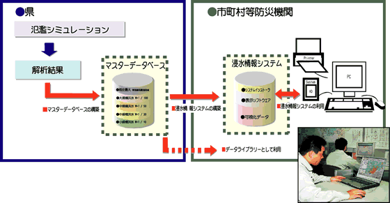 氾濫シミュレーションの最終的な目標は、市町村等防災機関に、浸水情報を「わかり易く」「多様なニーズに応じて利用できるように」提供することにあります。 シナリオ別に解析した情報は、想定破堤点毎に数万個のメッシュと約30時間に及ぶ時空間分布を持つので、情報総量は莫大な規模になります。 そこで、地理情報技術(GIS)を用いて、浸水情報を地図上に図化して表示できる浸水情報システムを開発することにしました。 このシステムを使えば、ユーザーは、想定する水災シナリオ(7つのシナリオ)、情報の種類(浸水深・流速・到達時間・道路浸水情報など)、調べたい区域(任意のエリア)を選択すれば、時々刻々変化する浸水状況を動的に表示することができます。 一般的なパソコンに浸水情報システムを搭載したハードディスクを接続するだけで利用できるようになっています。 また、洪水ハザードマップの作成や独自の解析など、解析結果の数値情報が必要になる場合は、マスターデータベースを作成しますのでライブラリとして利用していただくことが可能です。 浸水情報システムは、セットアップインストーラを含めて、一台の可搬型ハードディスクに搭載します。したがって、どのパソコンでも、接続するだけで利用することができます。 |