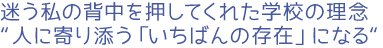 それまで調理の勉強をしていたことで進路に関して全く悩まなかったといったら、そうではありません。高校3年生のときは本当に悩みました。たまたまこの学校でオープンキャンパスに来たとき、学校の“目の前の人に寄り添う「いちばんの存在」になる”というポリシーにひかれて介護系に進むことを決心しました。