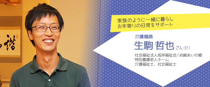 大学卒業後、「岩崎あいの郷」に就職して10年目です。この施設に入ったきっかけは一目惚れ。ユニットケアという手法でお年寄りの生活をサポートしながら、お年寄りと職員が一緒に生活する様子を見学して、家庭の雰囲気をすごく感じました。お年寄りと職員がテーブルを囲んで楽しそうに話をしていて、僕もここで働きたい!と思い、翌日には「働かせてください」と電話をしたほどです。これまで続けてこられているのも僕にとって今でもここが本当に理想の施設であるからだと思います。