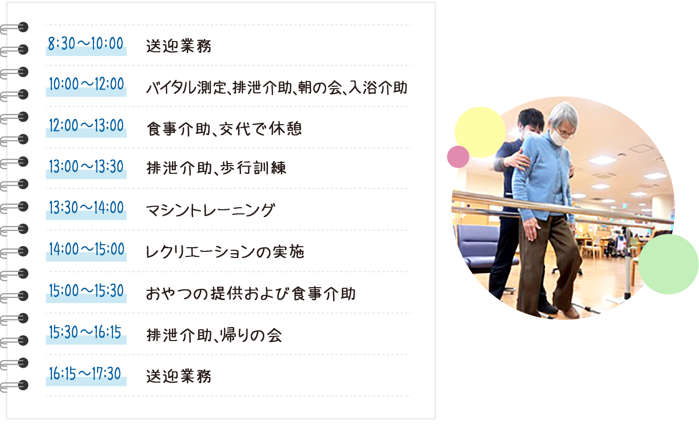デイケアでは1日のプログラムが決まっているので、スケジュール管理も重要。フロアマネージメントをする職員やリハビリ職員、介護職員がチームとなって入浴や食後の口腔ケア、排泄介助などの生活支援とリハビリを、全体を見ながらチームワークで行います。