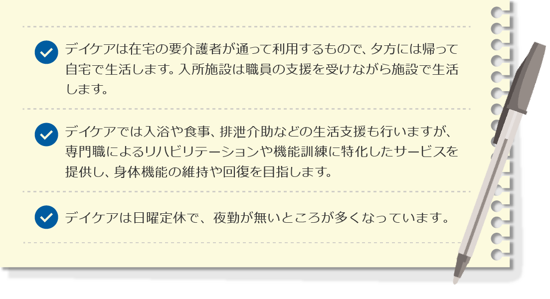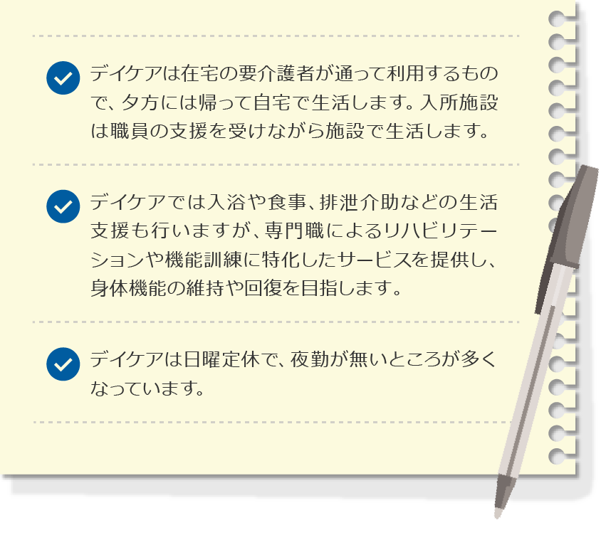 デイケアは日中のみ通う場所で、夕方には自宅に帰ることが大きな特徴です。入所施設は入居者さんにとって生活の場であって24時間施設で生活します。入所施設の介護職員も24時間体制で夜間のケアも行いますので、職員の勤務体制にも大きな違いがあります。