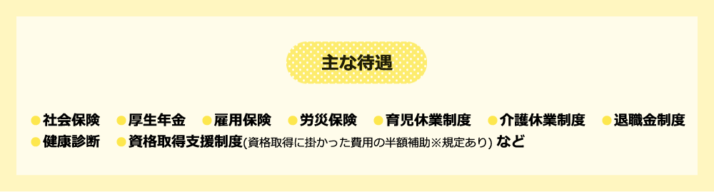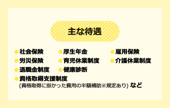 基本的な社会保険制度に加えて、資格取得も支援してもらえるからキャリアアップもしやすいね!残業が少ないのも職員さんたちが働きやすいように業務改善を積極的に行うからなんだね!