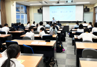 7月の事前学習会で生徒たちは、福祉経営コンサルタントで介護福祉士の服部暁生さんによる出前講座を受講。介護の仕事内容や介護の仕事の魅力について解説があり、熱心に耳を傾けました。