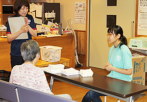 今回取材した期間での春緑苑の介護体験には希望者5人が参加。事前オリエンテーションで体験中の注意事項や心構えを聞いた後、生徒1人ずつ1ユニット(利用者10人)ごとに分かれて台拭きやお茶、おしぼり配りといった食事の準備、利用者とのコミュニケーション、洗濯物たたみなど介護職員のお手伝いをしました。
