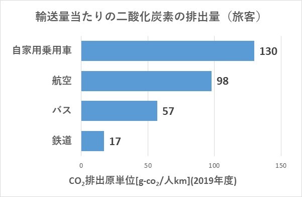 地球温暖化の要因であるCO2(二酸化炭素)について、クルマ(自家用車)が1人を1km運ぶのに排出するCO2の量は、鉄道の約7倍、バスの約2倍です。