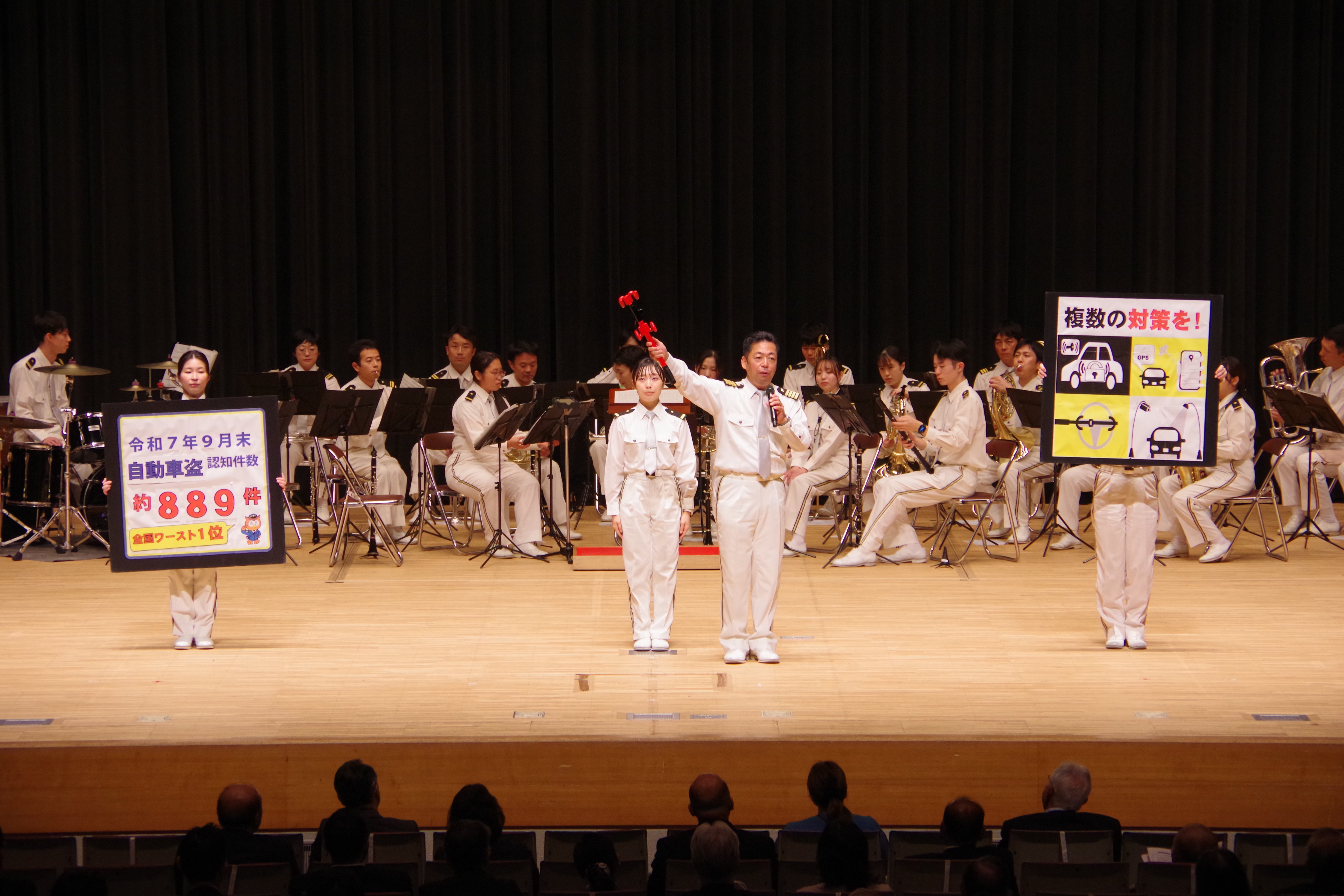 10月16日に開催した安全なまちづくり愛知県民大会の第一部では、安全なまちづくりや暴力追放に関して功労のあった個人・団体への感謝状の贈呈等を行うとともに、安全に安心して暮らせる地域社会の実現を目指して、テレビ愛知アナウンサーの上釜美憂さんが大会宣言を読み上げた後、参加者全員で「犯罪をなくそう」「暴力を追放しよう」と決意を唱和しました。その後、休憩時間には愛知県警察防犯活動専門チーム「のぞみ」による防犯寸劇、第二部では、愛知県警察音楽隊による演奏及び防犯広報を行いました。
