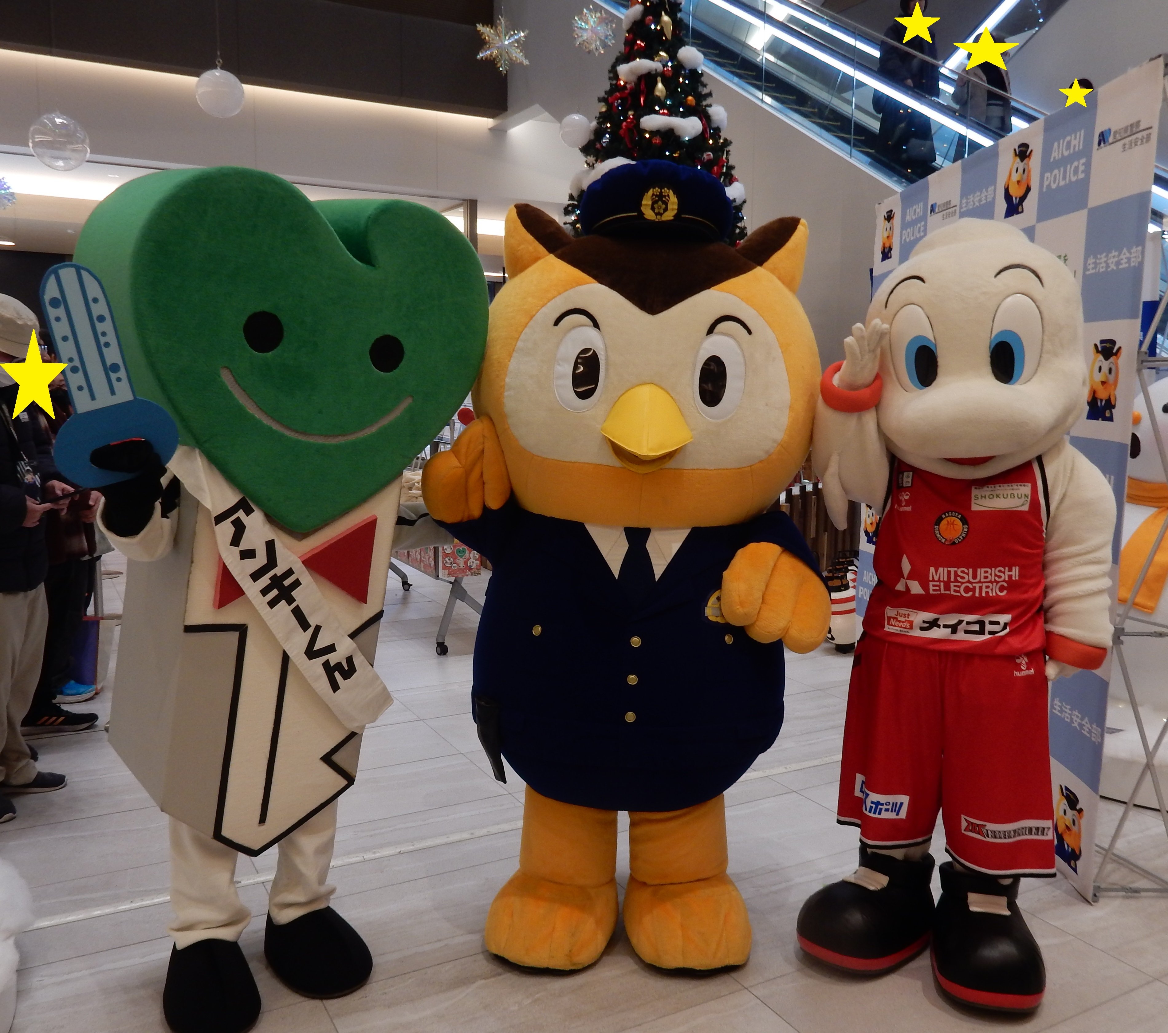 12月16日に実施した特別啓発活動では、前半は、地域や大学生の皆さんが行う防犯パトロールに対して出発式を行いました。出発式では、タレントのSKE48浅井裕華さん、中坂美佑さん、名古屋ダイヤモンドドルフィンズの佐藤卓磨選手が防犯トークを行うとともに、愛知県知事・名古屋副市長・愛知県警察本部長からパトロール団体の皆さんへの激励及び啓発品の手交を行いました。後半は、商業施設に移動して、県民の皆さんへ防犯啓発品の配布と被害防止の呼び掛けを行いました。