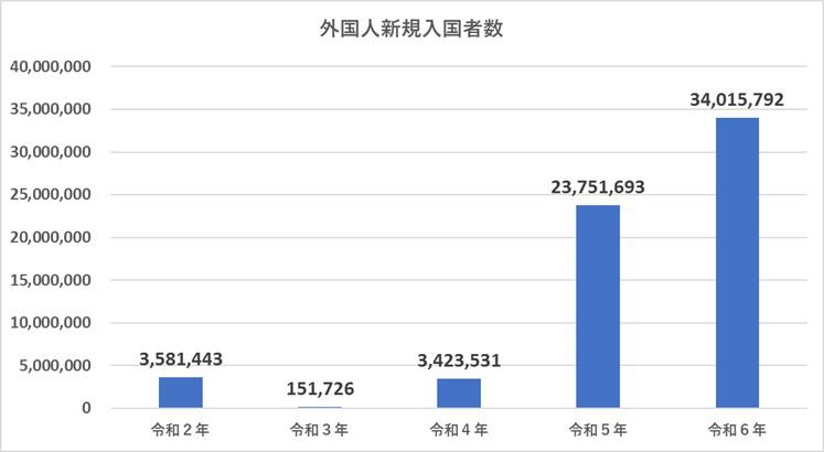 令和6年に日本へ新規入国した外国人は、3,401万5,792人で、前年同期に比べ1,026万4,099人(約43,2%)増加しました。