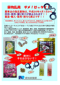 「危険ドラッグ」の乱用が社会問題化し、既に規制されていた販売目的所持等に加えて、平成26年4月1日から個人の所持、使用なども規制されており、違反者には3年以下の懲役、300万円以下の罰金又はこれらが併科されます。