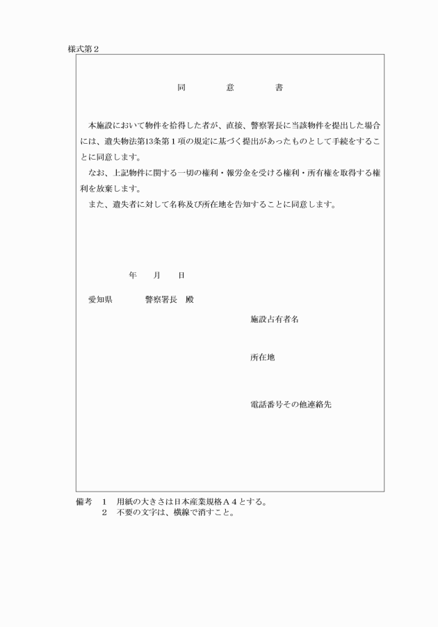 遺失物法(平成18年法律第73号。以下「法」という。)第13条第1項の規定による施設占有者から拾得された物件の提出を受けたときは、拾得者の当該物件に関する権利及び氏名等の告知に関する同意の有無について当該施設占有者に確認し、台帳等の施設内における拾得者に係る権利の有無等欄の該当の□内にレ印を付すこと。
