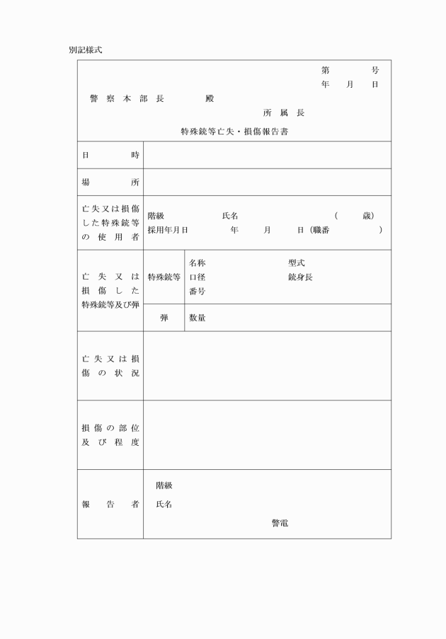 (2) (1)の報告を受けた管理責任者は、直ちに特殊銃等亡失・損傷報告書(別記様式)により警察本部長(装備課長経由。以下同じ。)に報告すること。