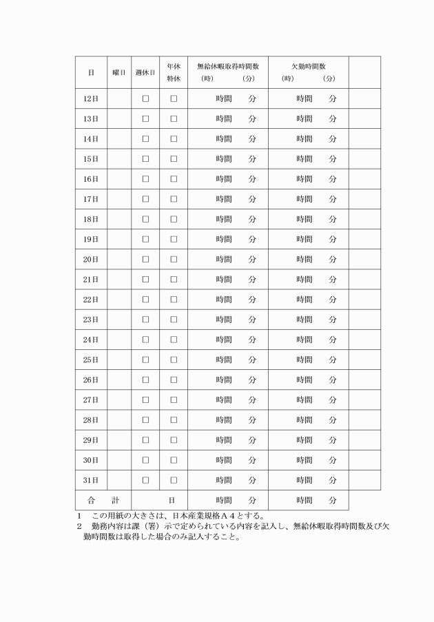 2 1の全勤務日数とは全日数(年度の途中において新たに任用された一般職非常勤職員については、任用日以後の全日数)から週休日及び休日を差し引いた日数とし、1の出勤日数とは全勤務日数から無給休暇日数(無給休暇の理由が、私傷病の場合に限る。)及び欠勤日数を差し引いた日数とする。