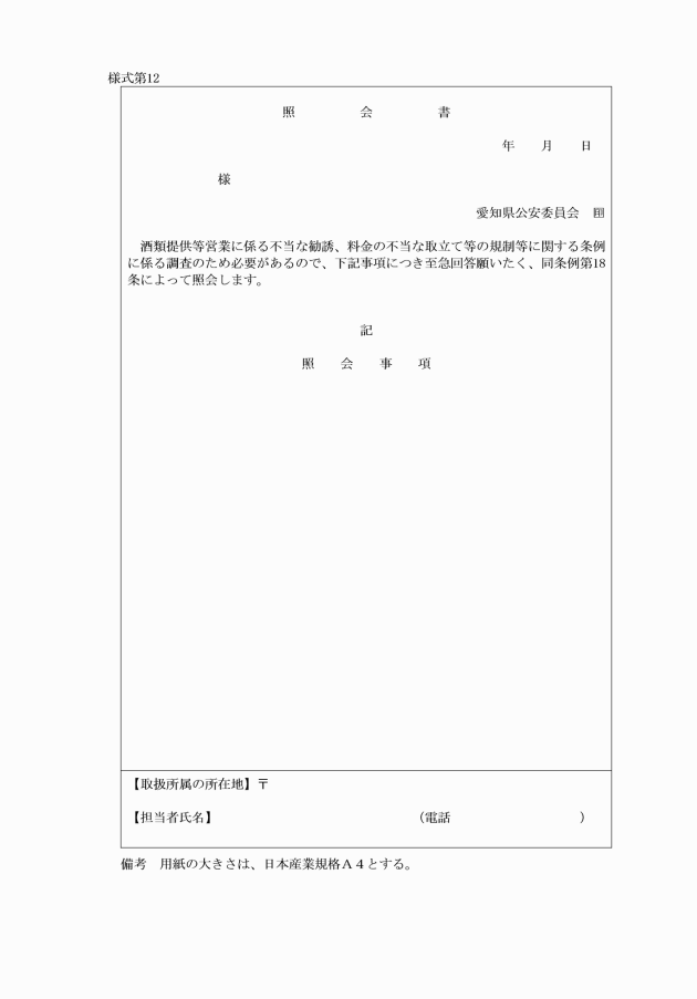 警察署長は、条例第18条の規定により関係機関に照会を実施するときは、照会書(様式第12)により行い、これに公安委員会の公印(愛知県公安委員会公印規程(令和5年愛知県公安委員会規程第1号)に規定する公印をいう。)を押印して施行するものとする。