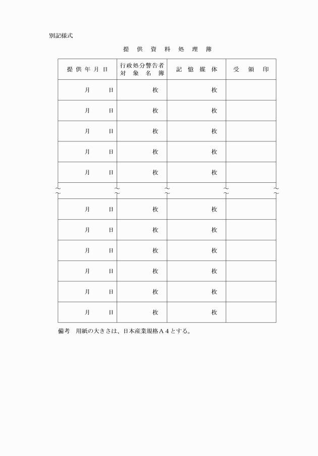 (1) 法第29条第1項第3号に規定する通知業務に係る資料にあっては、様式第1の行政処分警告対象者名簿又はその内容を入力した記憶媒体(以下「行政処分警告対象者名簿等」という。)