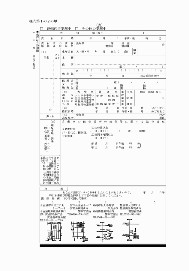 〔昭48交指発甲60号・本様式追加、昭57交免発甲4号昭61交指・交免発甲30号昭62交企・交指・駐対・交制・交管発甲16号平元交指発甲50号・本様式一部改正、平3務警発甲28号・旧様式1の2の丁を一部改正し繰下、平4交指・交免発甲44号平8交総・交指・交制・交免・交試・交東免発21号平10交総・交指・交駐・交制・交免・務警発甲27号平14交指発甲136号平16交指発甲126号・本様式一部改正、平20交指・交免発甲138号・旧様式1の2の己を一部改正し繰上、平29交総発甲30号・本様式一部改正〕