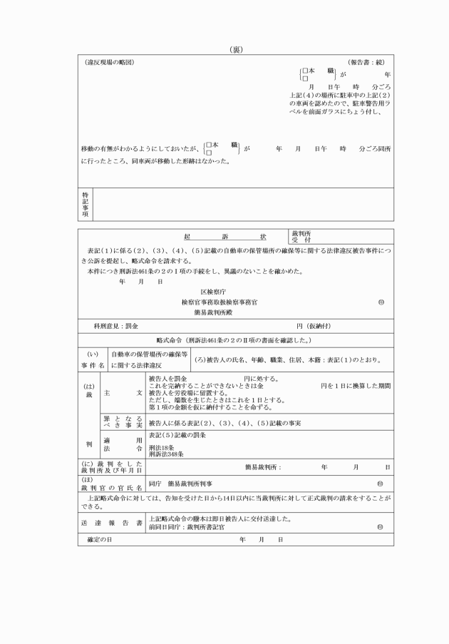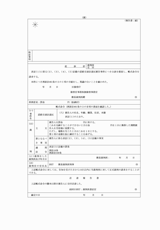 2 違反事実の認定は、公訴提起の必須条件であるのみでなく、この制度の成否を決定する最も重要な事項であるので、「違反事項・罰条」欄の記載については、特に正確を期し、その他の記載欄についても誤字、脱字等がないよう正確を期すること。