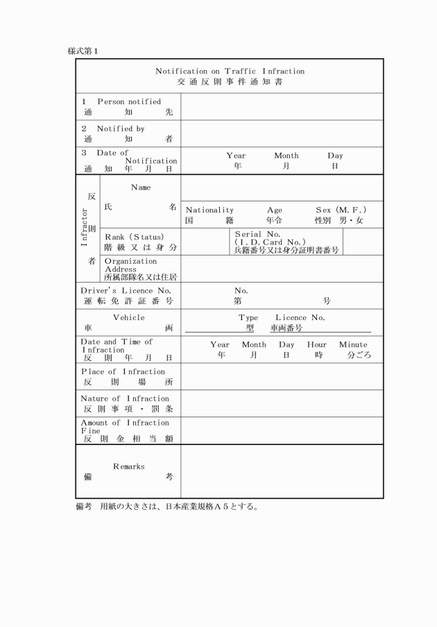 なお、現場に通訳がいない場合は、身分証明書および運転免許証(運転許可証)により反則者の氏名、階級および所属部隊または住所等を確認しておき後刻通訳を介するなど適宜な措置を講じて告知するようにすること。