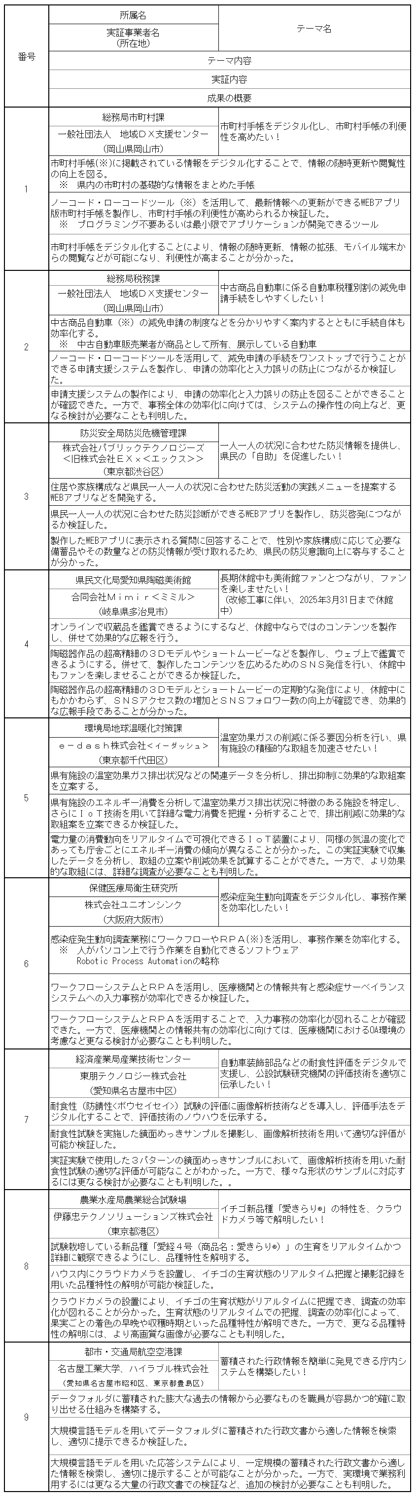 これまで、2023年8月に実証実験の実施を決定した9件の行政課題について、採択した企業等(実証事業者)の皆様と協力してICTを活用した解決策について実証実験を行ってきました(実証事業者の決定については2023年8月24日発表済み。)。