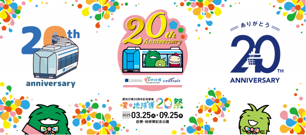 愛・地球博20祭の開幕に向け、更なる機運醸成を図るため、愛知万博と同様に20周年を迎えるリニモ及び中部国際空港セントレアとコラボしたオリジナルロゴマークを作成しました。今後、このロゴマークを活用し、愛知高速交通株式会社(長久手市)及び中部国際空港株式会社(常滑市)と連携したPR活動を行います。