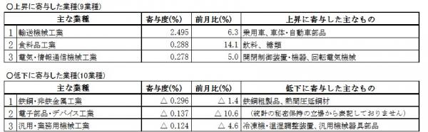 上昇又は低下の寄与度が上位3業種までを掲載し、寄与した主なものは2品目まで掲載しています。
