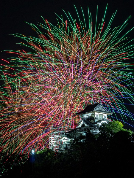 - 幻想的な花火と綺麗にライトアップされた犬山城が融合している、迫力のある作品です。
