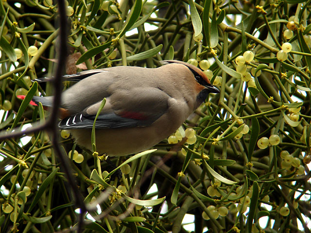 尾の先が赤いのが特徴です。3月から4月頃、特に大木に寄生するヤドリギの実を食べに毎年のようにやってきます。食べられたヤドリギの種子がこの鳥に運ばれます。種子は糞に混ざり、別の木に付着することでヤドリギは分布を広げます。