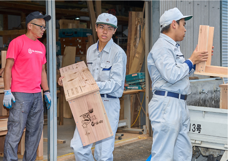 田口高校林業科では、木や山に関係する、いろいろな実習授業を行っています。「働く」ことを意識し、授業から生まれた製品や作物は、実際の社会のなかで利用・活用されています。