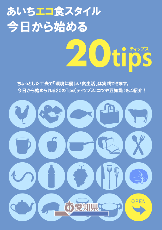 パンフレット「あいちエコ食スタイル 今日から始める20tips」では、具体的なコツや豆知識(=tips)を紹介しています。