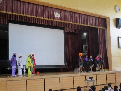 昼放課を利用し各回2学年ずつを対象に食育劇を上演しました。給食委員の児童は武器や大きな身振り手振りを交えて演じ、給食を残さず食べること、バランスよく食べることの大切さを伝えました。