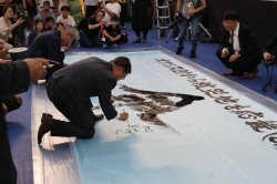 会場では、長さ8mの布に、一ノ瀬芳翠さんが「オアシス21から被災地を応援しよう! 命」と大書を書かれた後、私も、被災地の一日も早い復旧・復興を祈り、「心一つに」とメッセージを書き込みました。