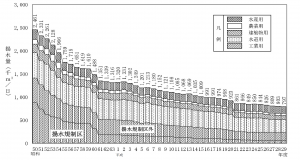 用途別では農業用水が約50%、続いて生活用水の約30%、工業用水の約20%の順となっており、生活用水は、人口の増加などにより漸増しています。