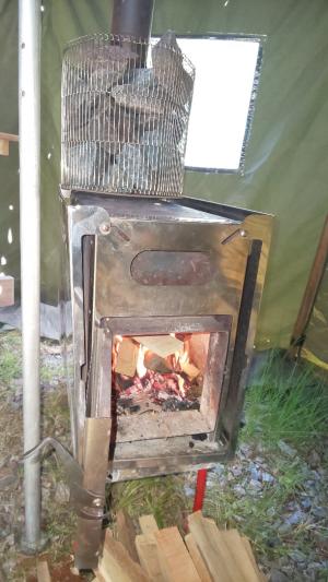 そして、テントの中のストーブに薪を入れ、テント内の温度を上げていきます。