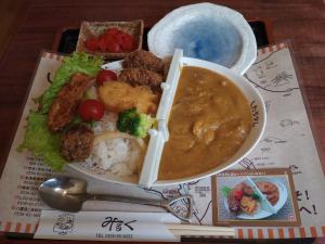 設楽町でとれた鹿肉のヒレカツや設楽町キャラクターのとましーなちゃん を型どったハッシュドポテトが入っていて見た目もにぎやかで、カレールーもまろやかな味で美味しくいただきました。