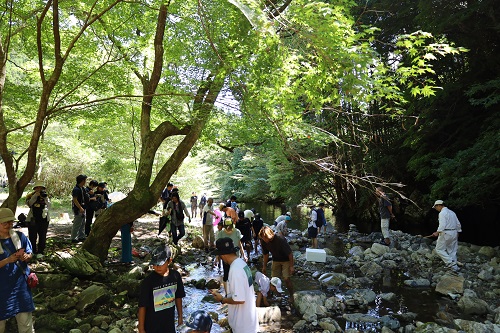 当貝津川支流での魚つかみ、川遊びの様子。現地の方々と協力してつかまえていました。(豊邦区・田原市)