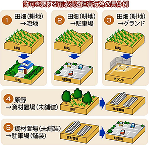 ここでいう開発行為とは、土地を開発することで、開発前より雨水がしみ込みにくくなる行為を指します。
