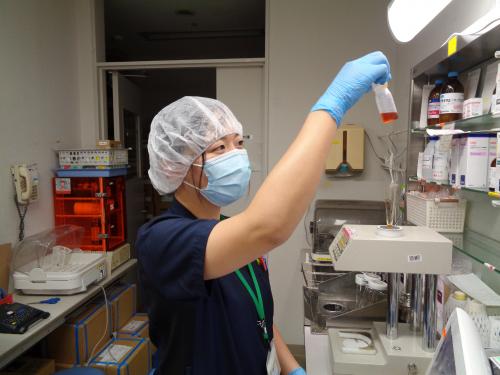 病院薬剤師として、入院患者さんに使用する内服薬や注射薬の調剤、担当している病棟の患者さんの服薬指導などを主に行っています。小児専門病院という特性上、薬の量を細かく調整する必要があったり、飲みやすくしたりするために、粉薬や錠剤をすりつぶして調剤することが多いです。薬を飲むのが難しい患者さんの場合には、飲みやすい方法を一緒に考えることも仕事の一つです。