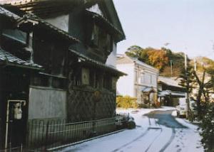 知多市の代表的景観スポット。 珍しく雪が降った街並、蔵や郵便局がならんでいます。旧道沿いの家は江戸時代からの街並を作っており、雪が降った時の街並は一段と美しいです。