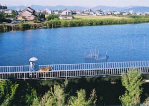日光川ウォーターパークに通じる橋、散歩道としての多くの人々が訪れます。大善川の水面に映える家並み、遠くに見える鈴鹿の山々。自然の恵みを大切にし、残し伝えたい風情です。隣を流れる佐屋川には四季を通じた釣堀センターがあります。