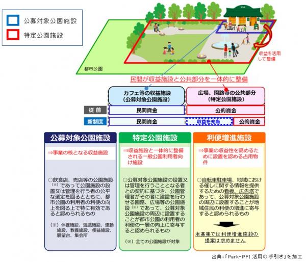 Park-PFIは、2017年の都市公園法改正により新たに創設された、飲食店、売店等の公園利用者の利便の向上に資する公募対象公園施設の設置と、当該施設から生ずる収益を活用してその周辺の園路、広場等の一般の公園利用者が利用できる特定公園施設の整備・改修等を一体的に行う者を、公募により選定する手法。