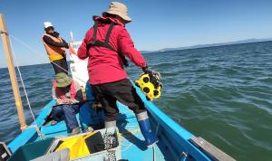 海草などの生育に適した環境条件を把握するため、田原市江比間町、西尾市一色町佐久島、南知多町片名の周辺3地点で、水中ドローンによる海草の生育状態調査と、現場の水温、日照、塩分濃度、底質などを調査しました。