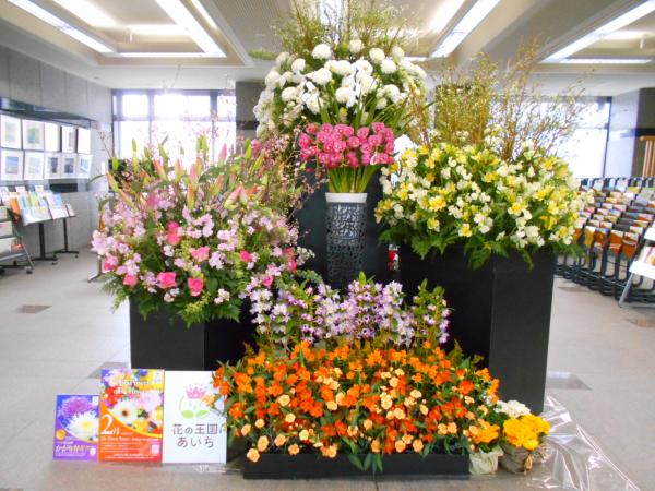愛知県と国立研究開発法人量子科学技術研究開発機構が共同で開発した「かがり弁ギク」をはじめとする愛知県産の菊や、ばら、カーネーション、コチョウラン、デンドロビウム、ストック、スイートピー、アルストロメリア、トルコキキョウなどを飾っています。