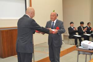 [表彰式にて加藤廣行氏へ記念品を贈呈]