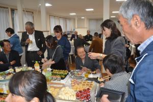 記念講演会終了後は和耕寮食堂に移動して懇親会が開催されました。懇親会では御講演いただいた鈴木氏も御参加いただき、美味しい軽食や菓子、飲み物のほか、農大産の名古屋コーチン卵を使用したプリンやナシも提供されました。懐かしい同窓生との旧交を温め、大盛況のうちに会は終了しました。